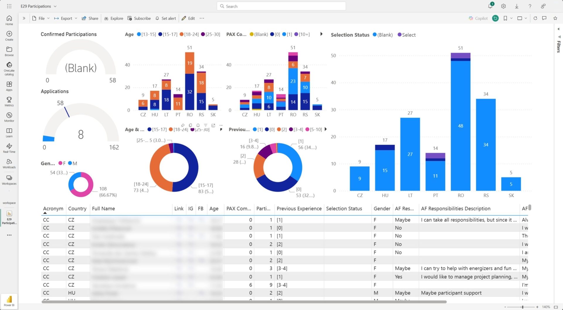 The development of online infographics using Microsoft Power BI allows our event coordinators to do real-time assessment of the status of a project, focusing on participant selection and the statistical analysis of target group elements such as age range, gender balance and previous experience.