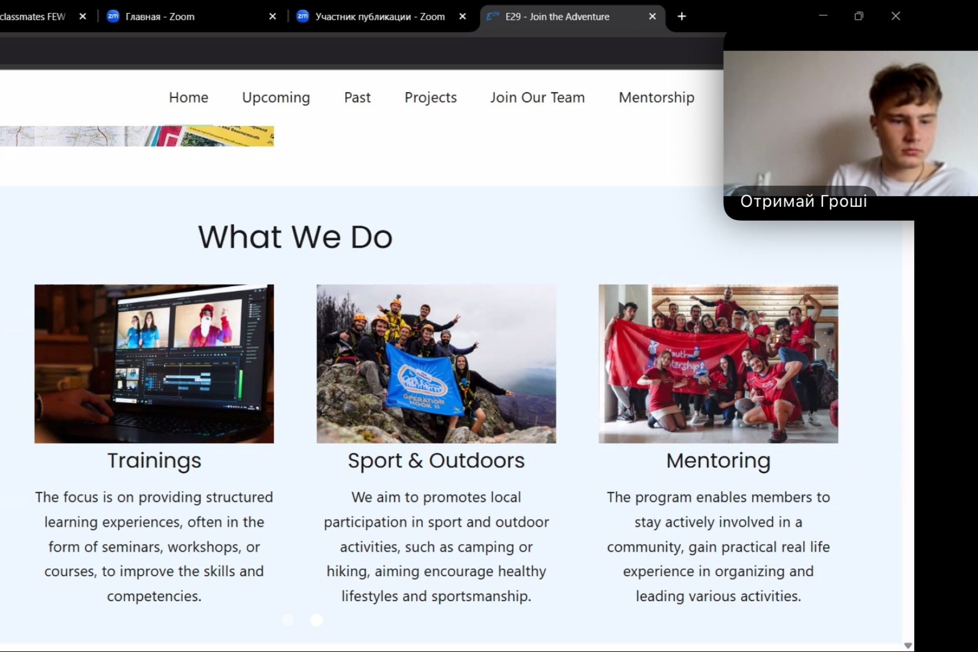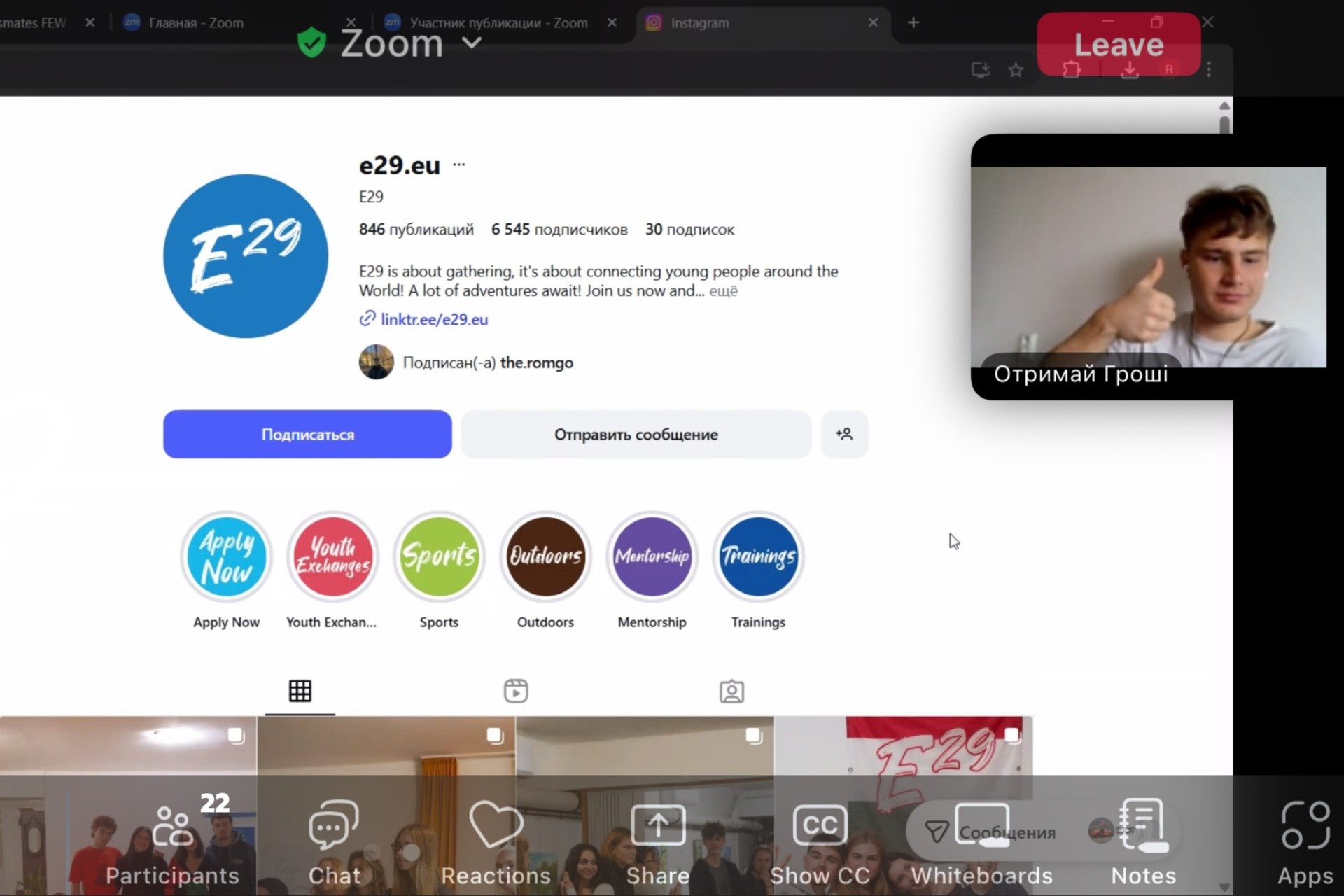 Dissemination held by Roman Khuda at Lviv National University of Ivan Franko, for 22 people. He held a Zoom call with his classmates, during which he introduced the E29 organization, presented the opportunities it offers, and explained how to apply for its activities.