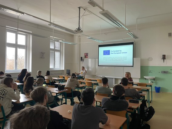 Sara Pavlíková gave a presentation to her 16 classmates, sharing her experience in the ‘Citizenship in Action’ project, which included the ‘Young People in Action’ activity. She talked about how the project allowed her to engage with the local community and develop valuable skills.