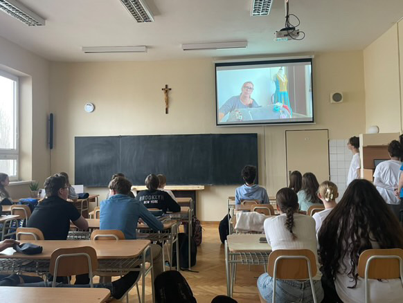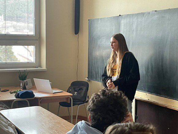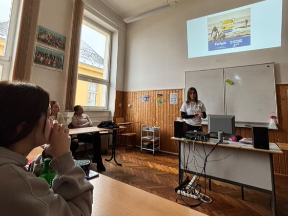 At Gymnázium sv. Františka z Assisi, Laura Carna presented the Young People in Action activity to her classmates. She showcased the documentary created by her group during the mobility and shared her personal experience, reflecting on the impact of the activity.